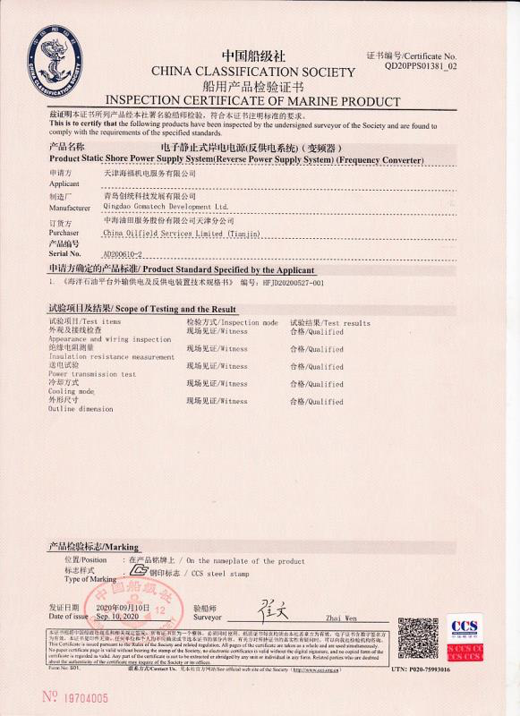 岸電設(shè)備通過了中國船級社認(rèn)證并獲得認(rèn)證證書,獲得國家電力電子產(chǎn)品質(zhì)量監(jiān)督檢驗中心檢測證書。