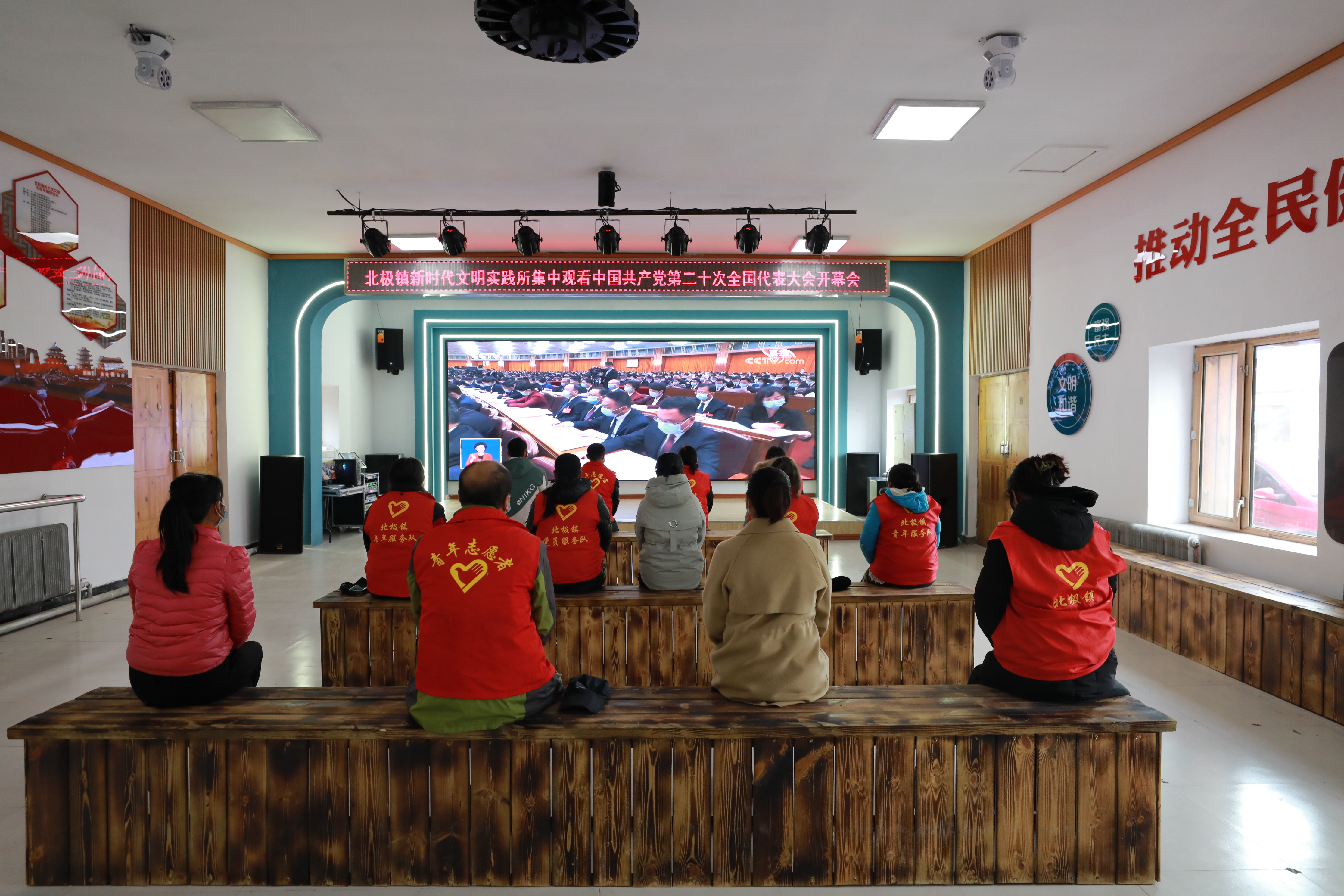 △黨員干部、志愿者、村民在北極村新時代文明實踐所收聽收看黨的二十大開幕盛況