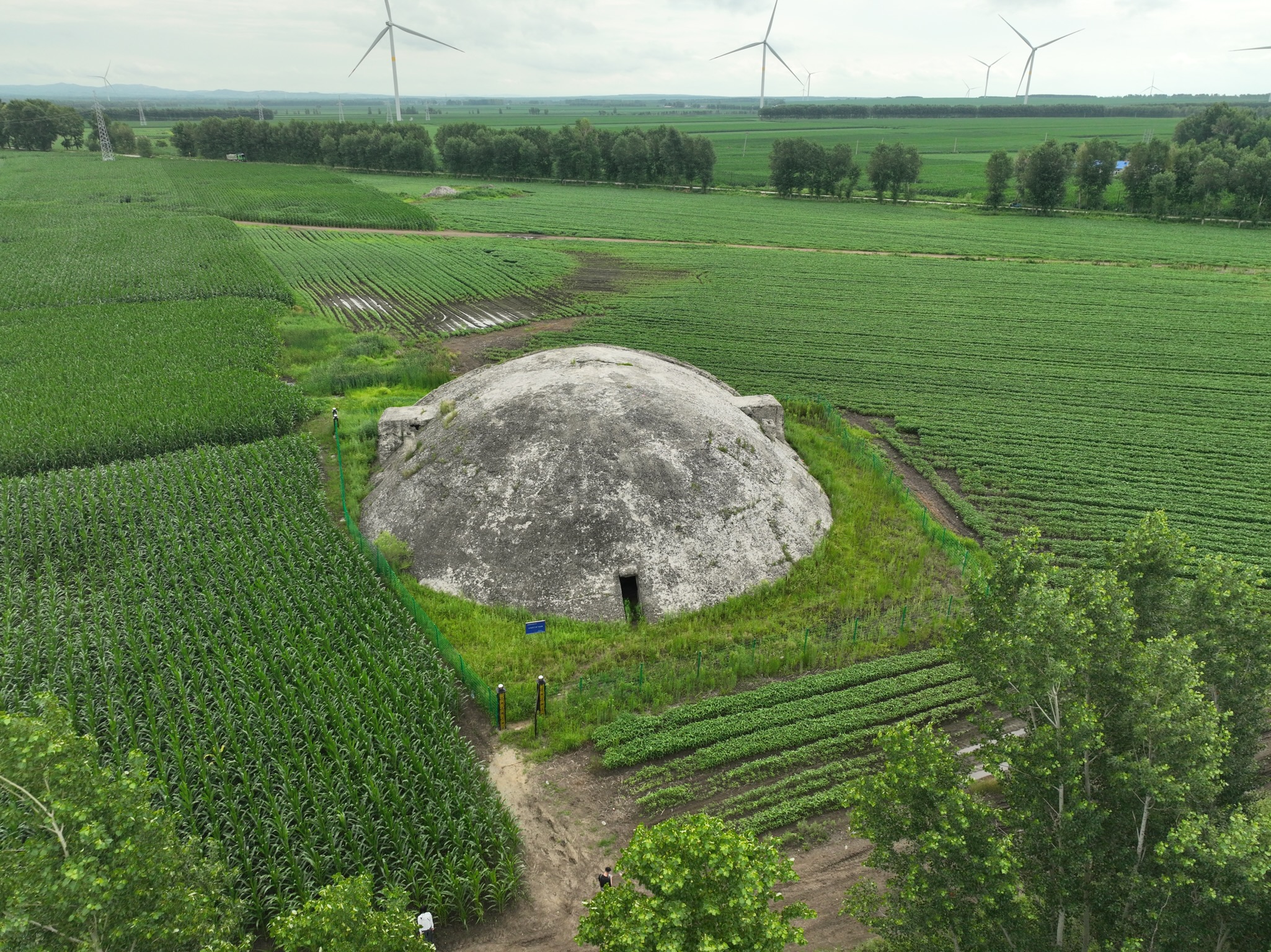 向土龍山鎮(zhèn)東行約1.5公里,一座形似巨大頭盔的混凝土建筑突兀地蟄伏于曠野——這便是“土龍東門外飛機堡”遺址。它是當年日本為侵略擴張所建龐大機場網(wǎng)絡(luò)中僅存完整的飛機庫,直徑逾10米,墻體厚達60厘米,冷硬地矗立了八十余載。